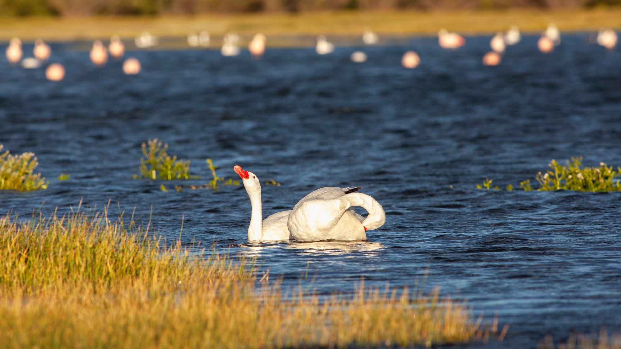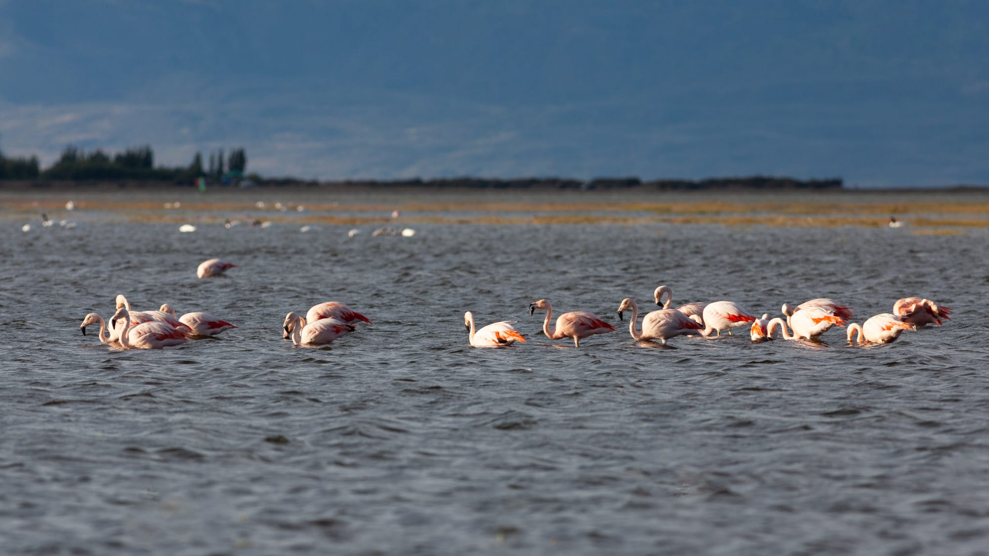 Det gjorde El Calafate derimod. Det er en stor turistby med masser af trængsel af mennesker og biler på hovedgaden. Men byen ligger smukt ved en bugt af den store sø Lago Argentino. I udkanten af byen er der endda en parkeringsplads, hvor motorhomes kan overnatte. Det ligger lige ned til vandet. Langs kysten er der et stort vådområde med et meget rigt fugleliv: bynær natur. Med deres lyserøde farve lyser flamingoerne op mellem hvide svaner med rødt næb, sorthalsede svaner og mange andre.