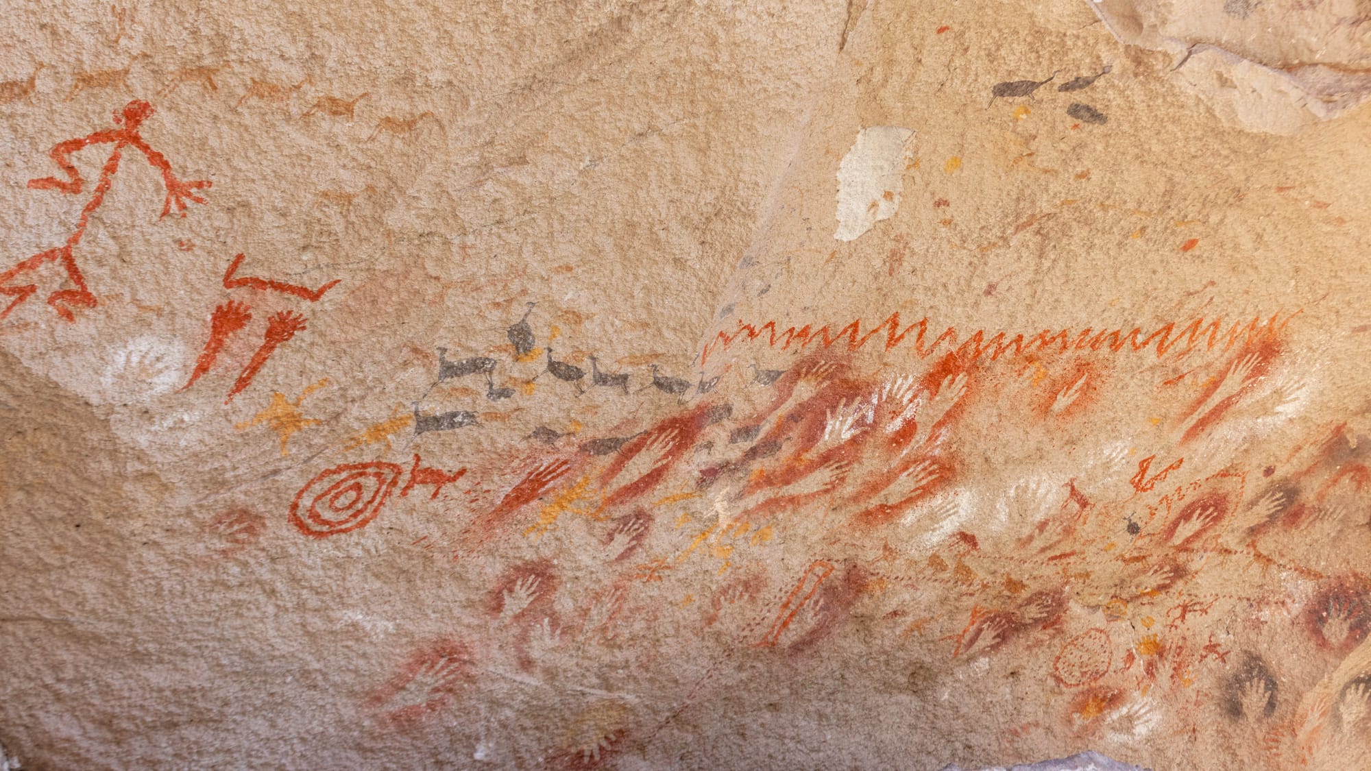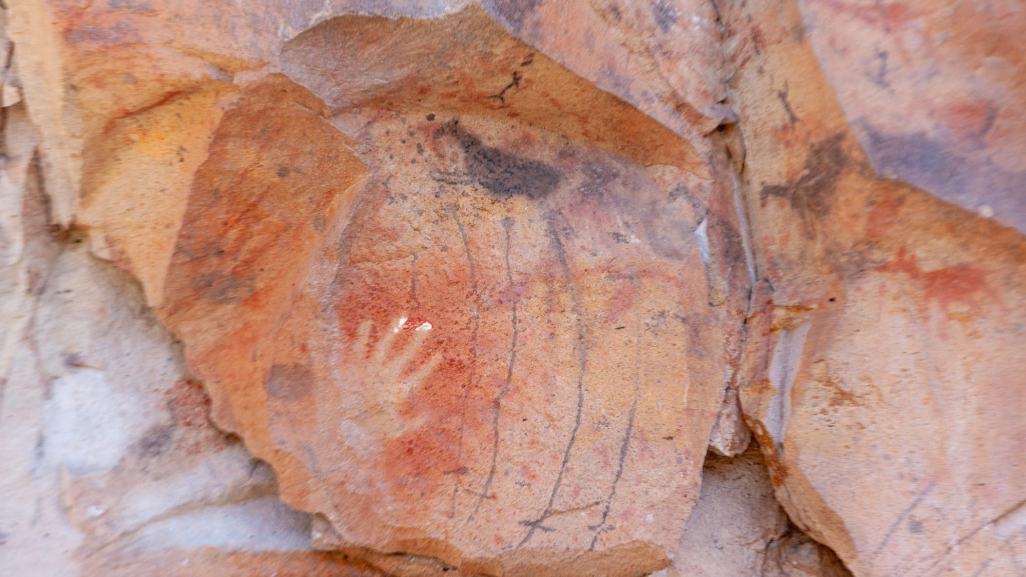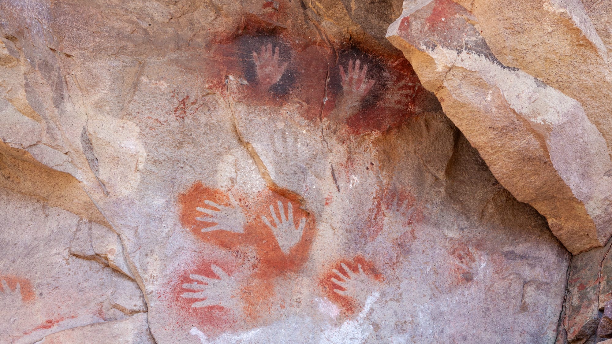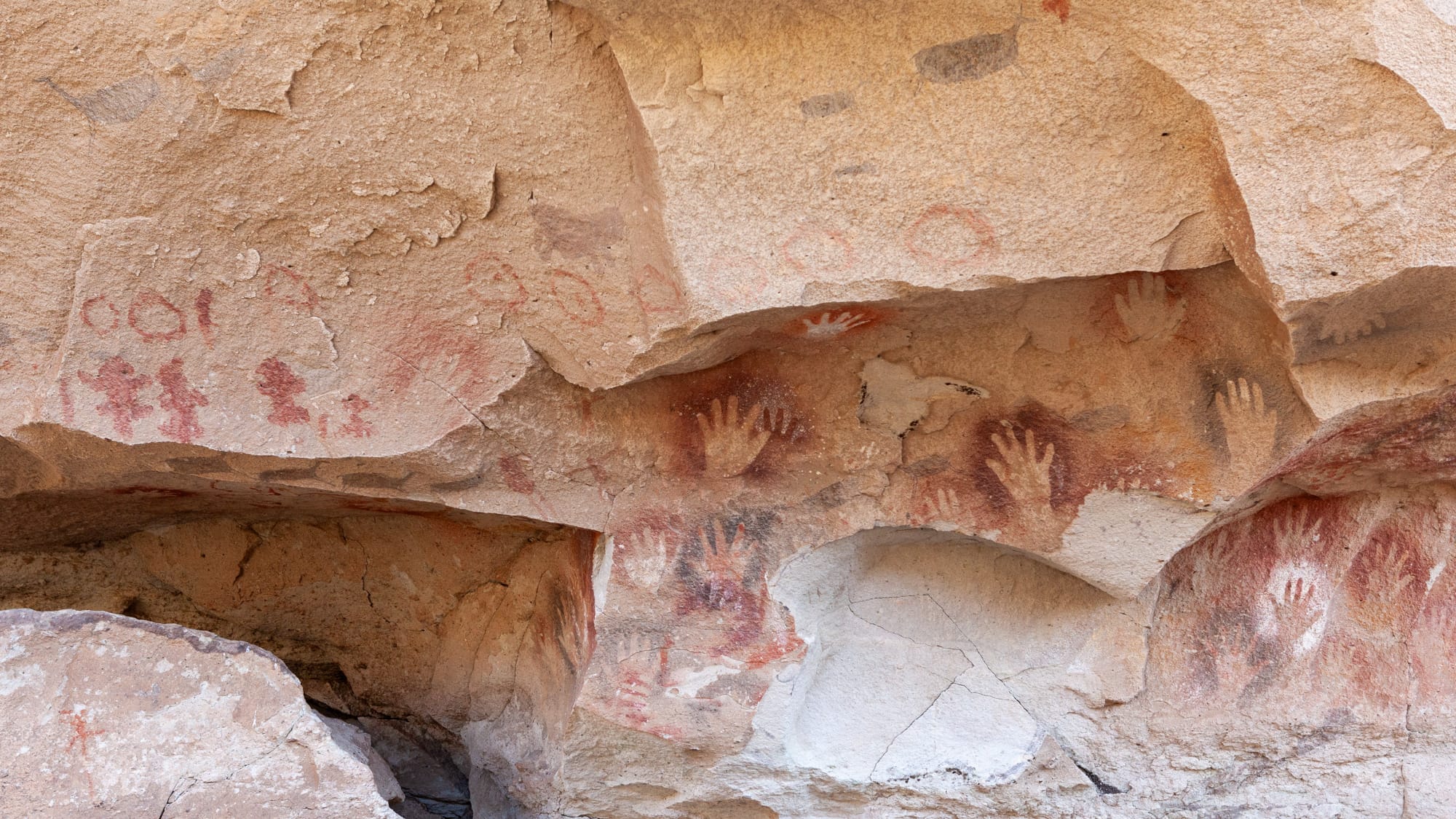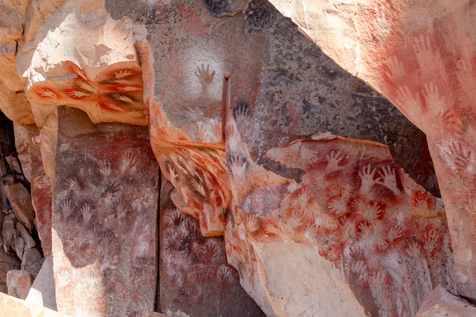 Fra Bajo Caracoles lavede vi en afstikker til Cuevas de las Manos, Hulen med hænderne. Det er en klippehule med forhistoriske hulemalerier, som hovedsagelig består af hænder. Vejen derud var 46 kilometer på de sædvanlige jammerlige grusveje med vaskebrætriller eller sten på størrelse med en knytnæve. Det tog med andre ord sin gode tid. På vejen derud kom en cyklist i modsatte retning. Landskabet var smukt og øde på den særlige patagoniske måde, og det blev endnu smukkere efterhånden, som vi nåede frem.