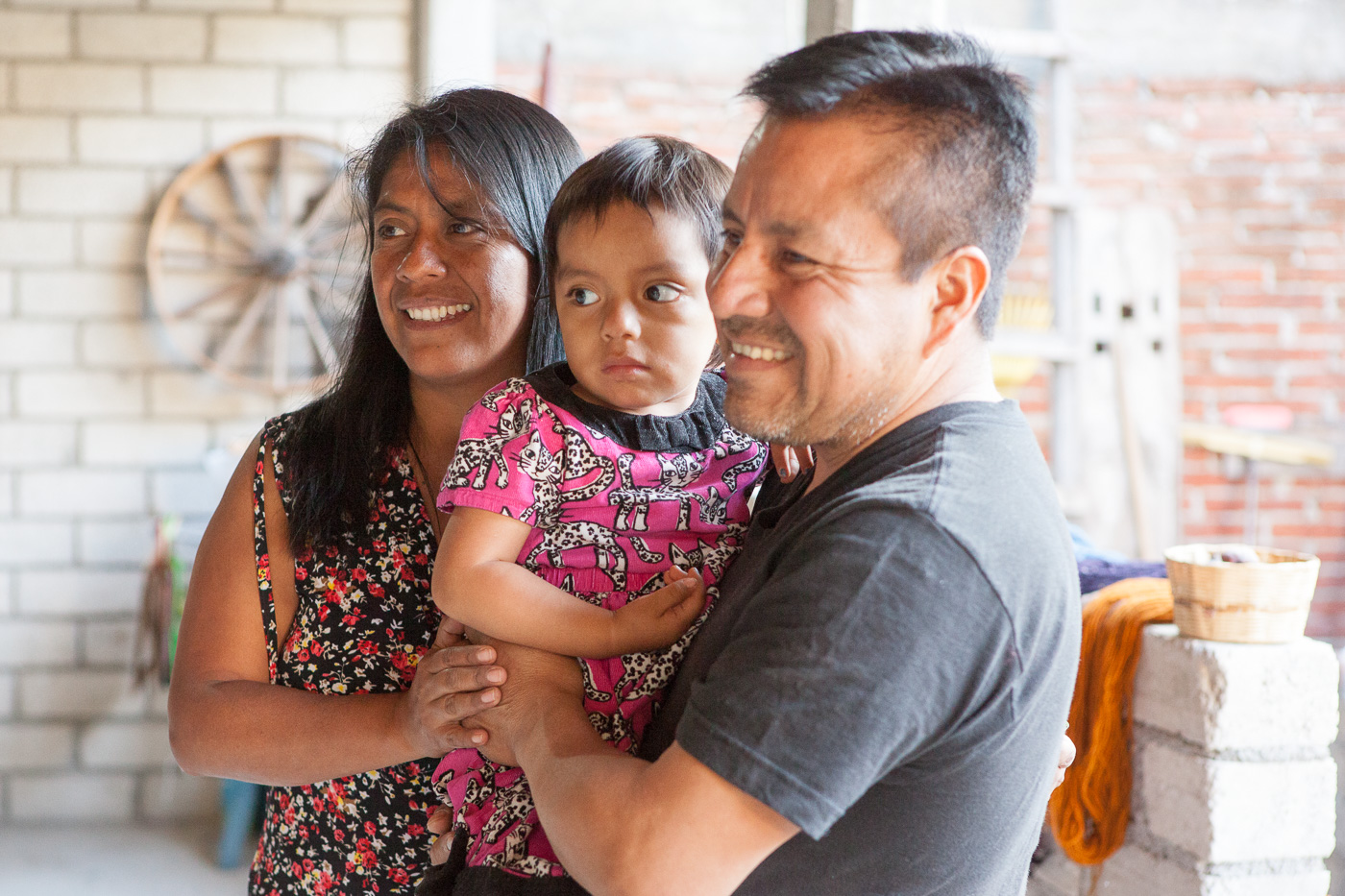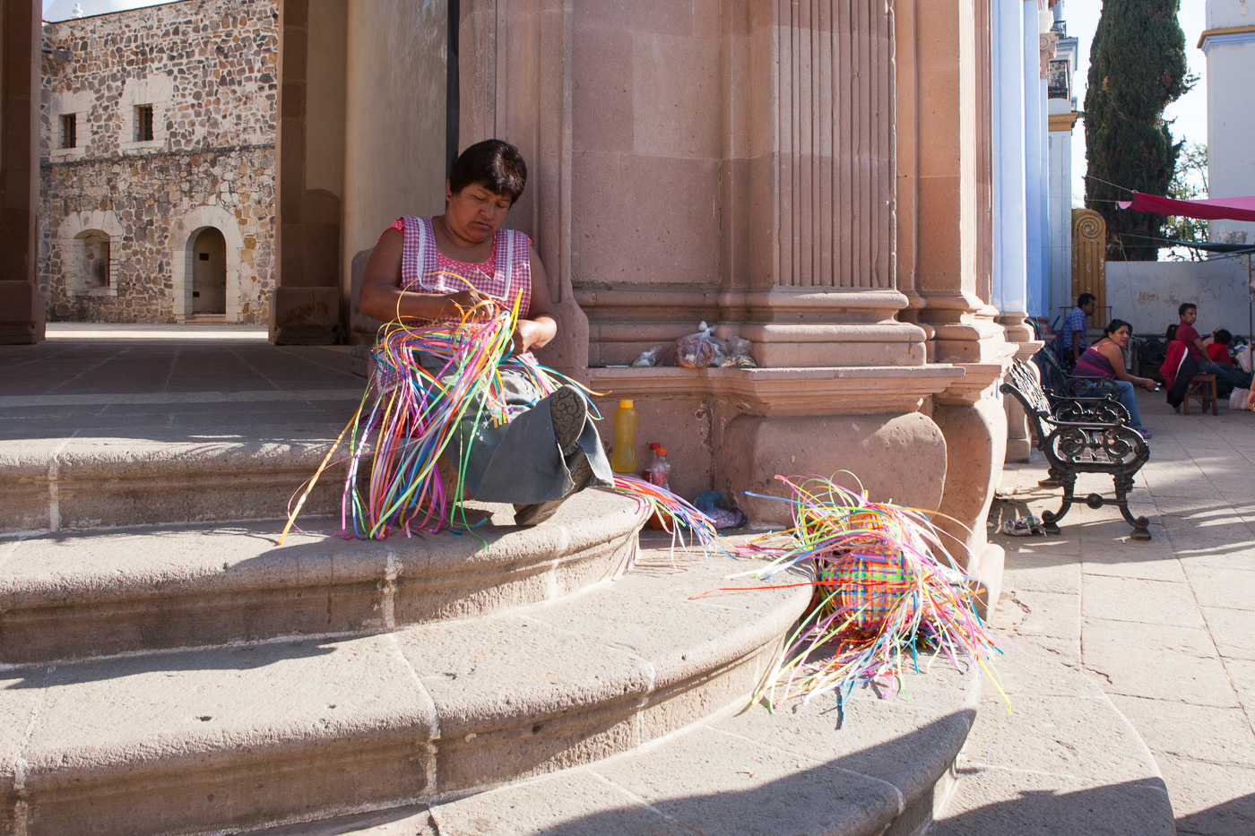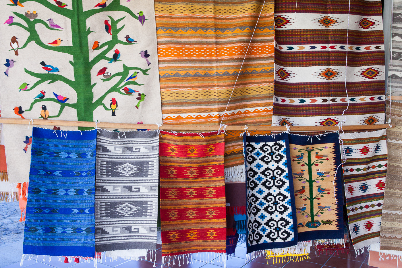 Derfra kørte vi til den lidt større by Teotitlan, hvor vi først så kirken. Dernæst besøgte vi tre forskellige, som vævede tæpper af garn, som de først havde kartet og spundet og farvet. Det er en tradition, at de forskellige landsbyer er specialiserede. I Teotihuan laver man tæpper, og det foregår typisk i små familievirksomheder. En af kvinderne kom derimod fra en landsby, hvor de flettede kurve, men hun havde ladet sig omskole til tæpperne, hvilket havde taget hende mange år. Arbejdet foregår i familierne, hvor både mænd og kvinder arbejder med det, og børnene lærer det, fra de er helt små.