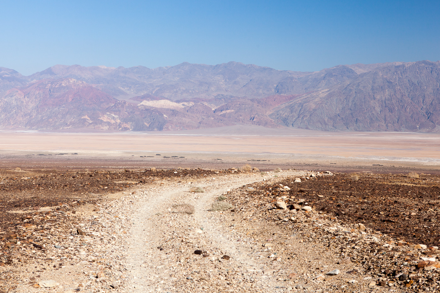 På østsiden af dalen er der en asfaltvej. Her kører der en strøm af turister. Det er også der, de mest spektakulære steder findes. Dem så vi sidst, vi var her. På vestsiden er der grusvej, og vi havde vejen for os selv. Vi havde udvalgt en sidevej, der skulle føre op til en canyon, og havde en forestilling om, at vi måske kunne nå en sidevej og sidedal mere. Vi blev klogere. Sidevejen var meget ringe, så det gik meget langsomt. Efter seks kilometer spiste vi frokost og bestemte os for at vende om. På tilbagevejen, hvor det gik nedad hele vejen, gik det endnu langsommere. Ligesom en traktor har bilen et lavt gear, hvor den kører i skridtgang og bare trækker. Det varede to timer at køre de seks kilometer ned. Hele vejen ned kunne vi nyde udsigten over Death Valley og fjeldene på den anden side.