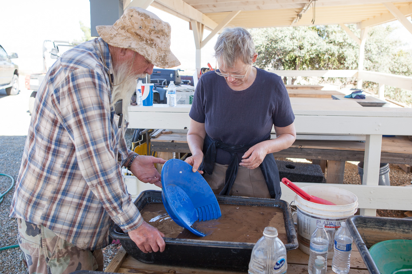 Woody havde et arbejdsbord stående med bakker til at vaske i og sand i spande. Her måtte vi øve os hele dagen, mens han tog til Superstition Mountains.