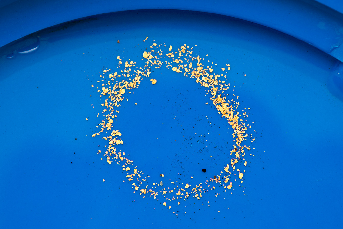 På billedet herover ses to personers samlede resultat efter et par dages arbejde: guld for 30-40 dollars. Læg mærke til vanddråberne i øverste venstre hjørne.